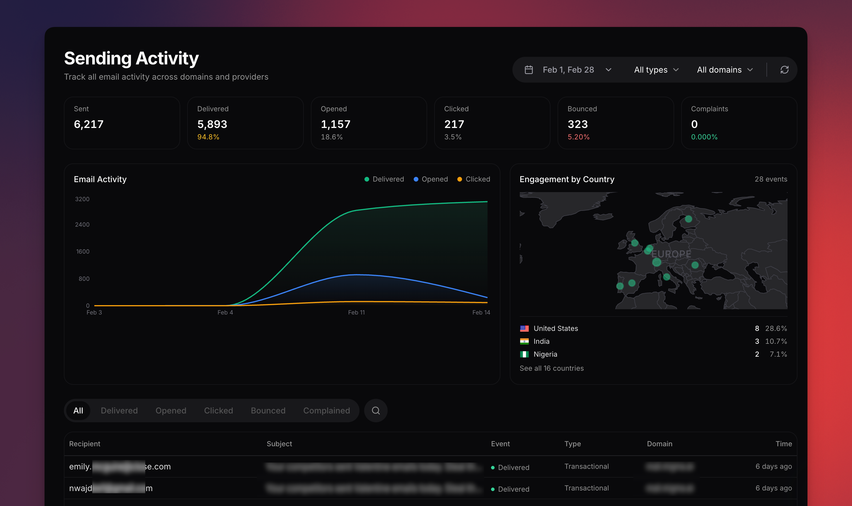 Send emails programmatically via the SDK, CLI, or API.The from address determines your sending domain — it must be a verified domain. The optional providerType field selects which email service provider delivers the message. It defaults to migma (built-in sending).