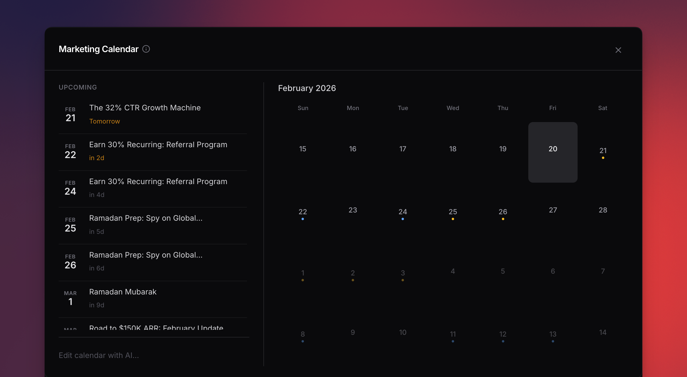 Go to your project and open the calendar tab. Suggestions generate automatically on first visit.