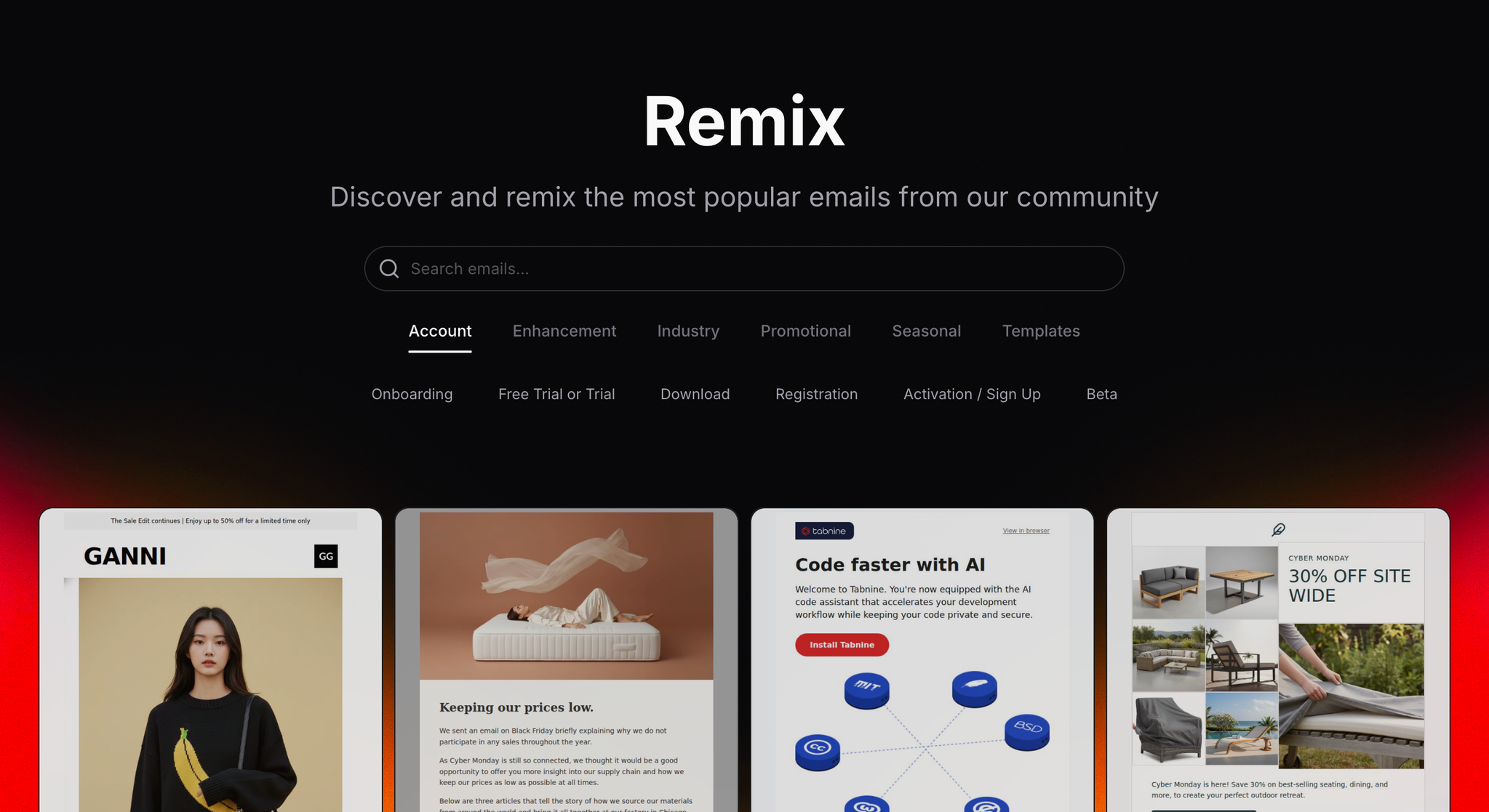 Browse a curated library of high-performing emails from top brands. Remix any email into your brand style with one click.